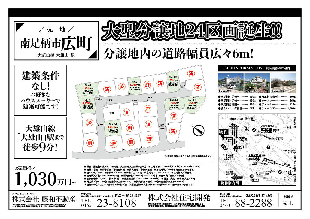 価格:1,030万円~1,270万円 土地面積:133.90㎡(40.50坪)~180.93㎡(54.73坪) 交通:大雄山線「大雄山」駅 徒歩9分