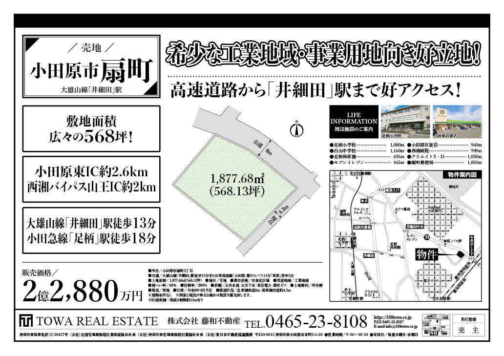 価格:22,880万円 土地面積:1877.68㎡(約568.13坪) 交通:伊豆箱根鉄道大雄山線「井細田」駅徒歩12分 小田急小田原線「足柄」駅徒歩16分