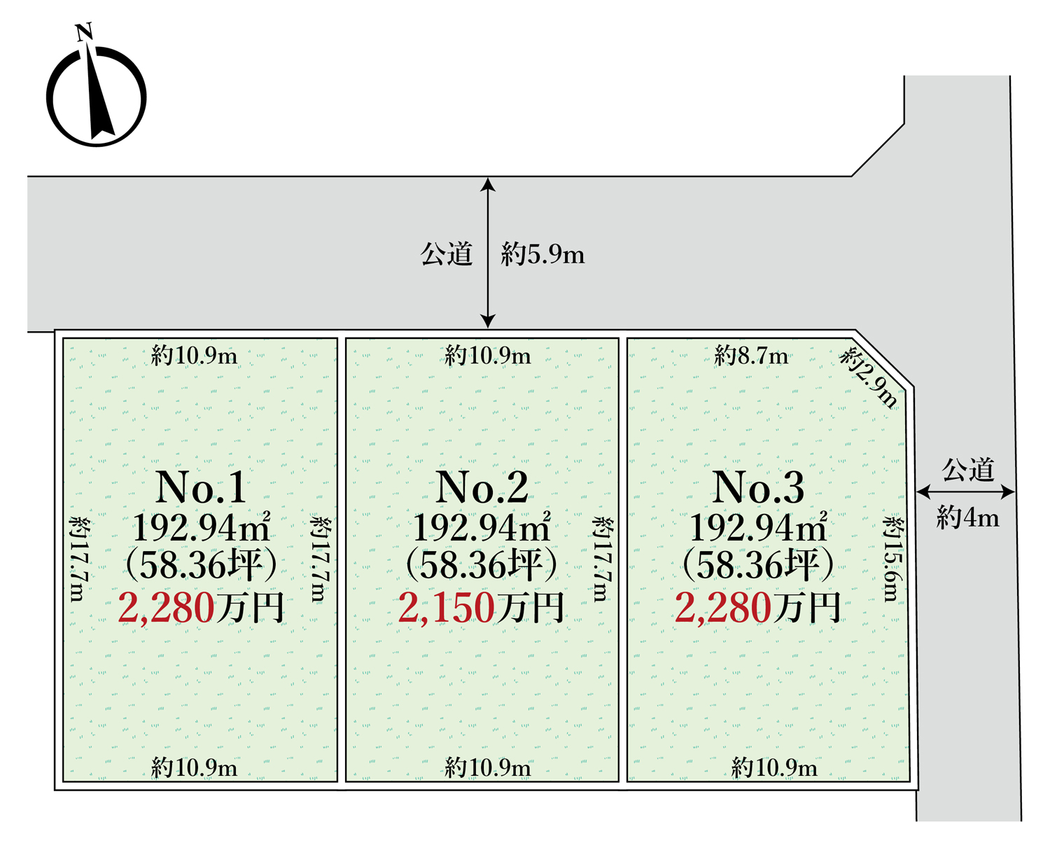 No.1区画 192.94㎡(約58.36坪) No.2区画 192.94㎡(約58.36坪) No.3区画 192.94㎡(約58.36坪)