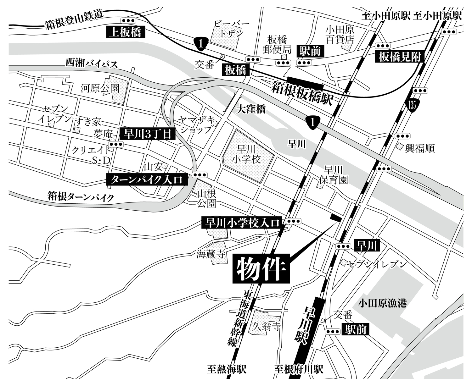 JR東海道本線「早川」駅から徒歩5分 箱根登山線「箱根板場」駅から徒歩10分