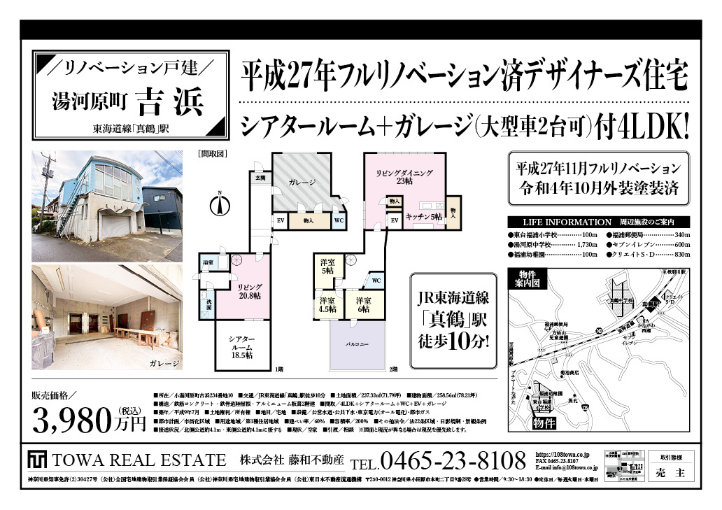 価格:3,980万円 間取り:4LDK+納戸+シアタールーム+WC+EV+ガレージ 交通:JR東海道線「真鶴」駅徒歩10分